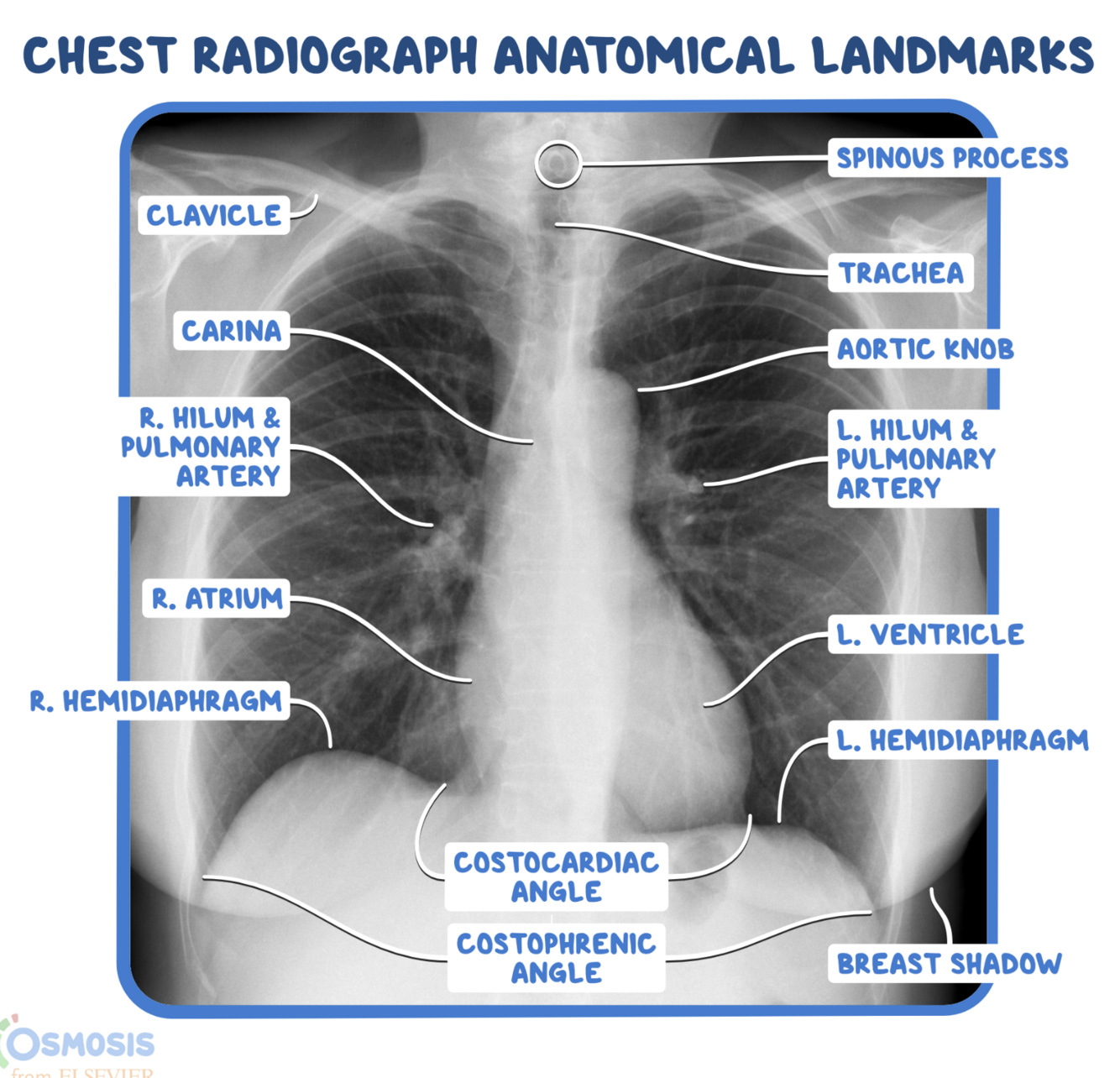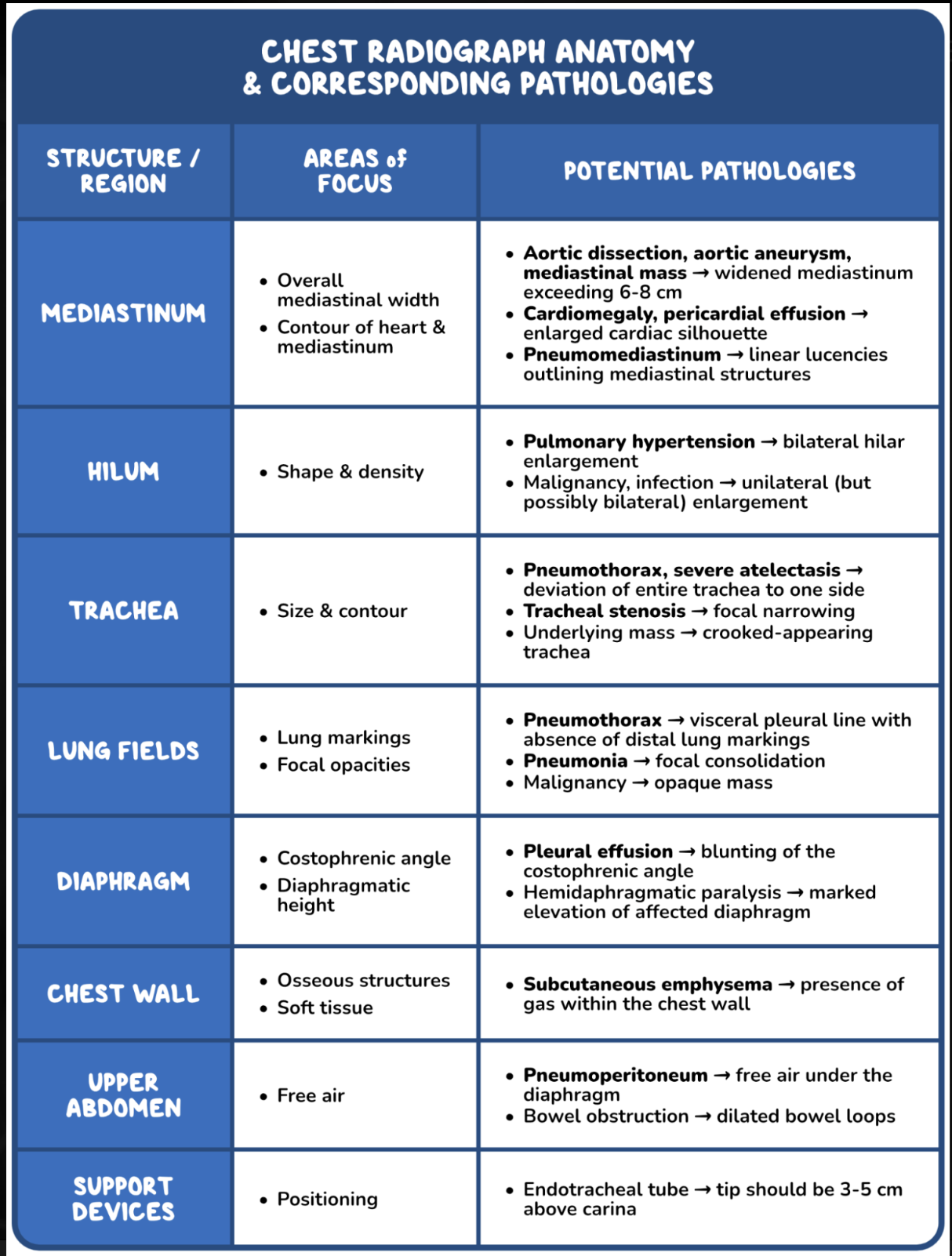 What are the structures and accompanying pathologies seen on a chest x-ray?