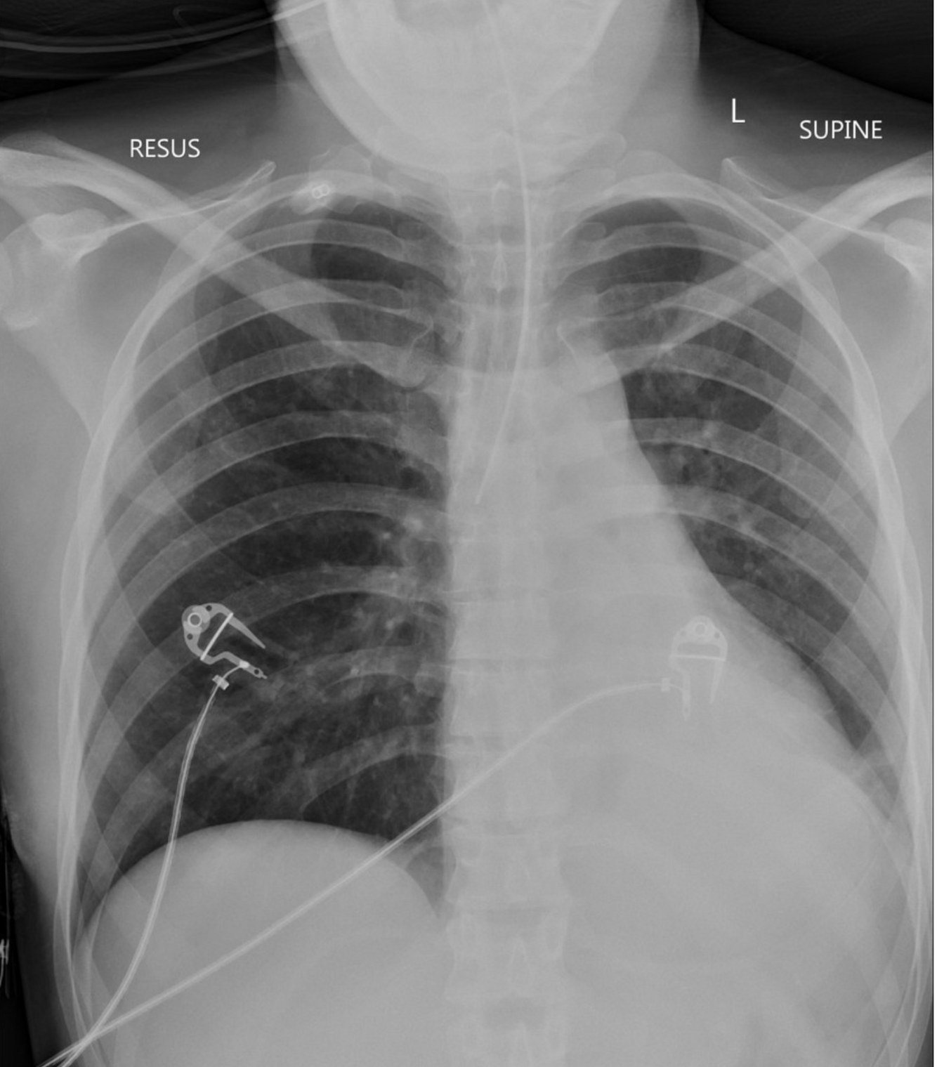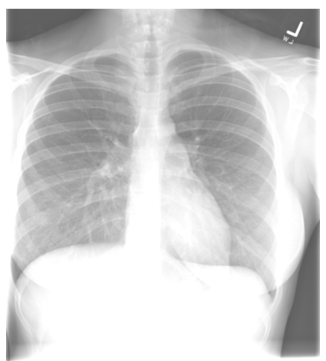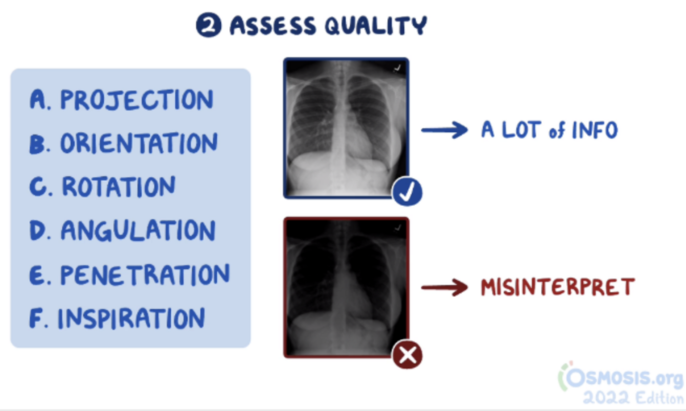 The quality of a chest x-ray is determined based on a combination of penetration, inspiratory effort, and rotation. Technical view describes whether an image is taken via an AP or PA approach. A chest x-ray was appropriately obtained in the workup of this patient’s symptoms. The above image demonstrates adequate inspiratory effort, underpenetration, and midline alignment. When reviewing a chest x-ray, it is important to assess its quality and technical view, which describes whether an image is taken anterior-posterior (AP) or posterior-anterior (PA). Quality is based on a combination of three metrics: The first metric is penetration, which describes the extent to which the x-rays have passed through the patient’s body. If a study is adequately penetrated, then the lower thoracic spine should be visualized through the cardiac shadow. If the lower thoracic spine is not visualized, the study is under-penetrated. In contrast, in an over-penetrated study, too many x-rays pass through low density structures, causing the lung fields to appear black, increasing the risk that pathologic findings are missed. The second metric is inspiration. In a film with adequate inspiratory effort, 8-10 posterior ribs can be seen above the diaphragm. The final metric is rotation, which can be determined by evaluating the relationship between the clavicles and the spine. If the medial ends of the clavicles are equidistant from the thoracic spinous process, then the patient is midline and not rotated.