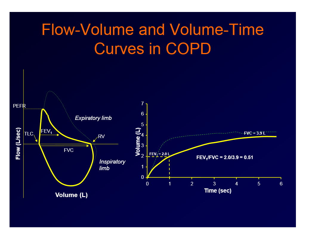volume-time curve flatter and takes longer to get closer to FVC