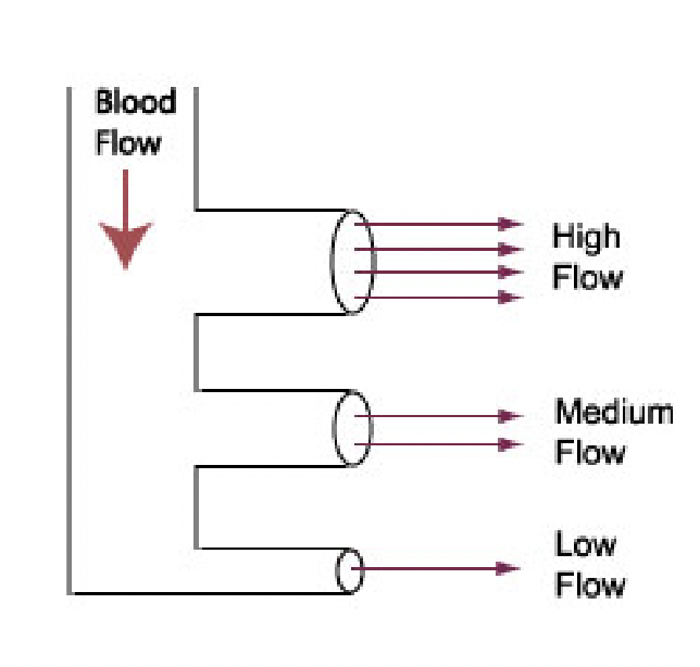 Return to heart. Low pressure. Low resistance. Slow flow. Large radius