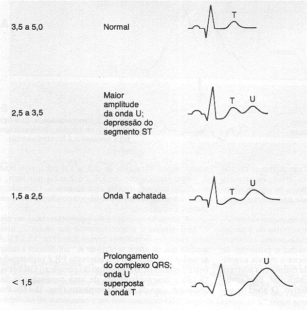 Diminuição da amplitude das ondas T (onda T é proporcional ao nível de potássio no sangue, guarde este macete!)