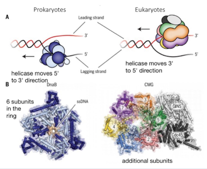 In eukaryotes helicase moves 3’ to 5’ in the leading strand