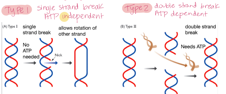 Type 1 creates a single strand which allows the rotation of the other strand (NO ATP)