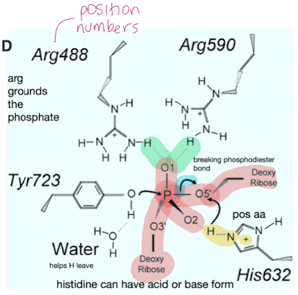 histidine acts as a positive amino acid and creates hydrogen bond with the 2’ Oxygen and also donates a proton the 5’ O connected to the deoxyribose