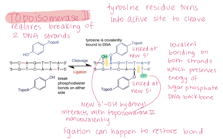 Topoisomerase II covalently binds to DNA on both sides and makes a new 5’ end. This preserves the energy of the sugar phosphate DNA backbone. This breaks phosphodiester bonds and creates a 3’OH after the cleavage.