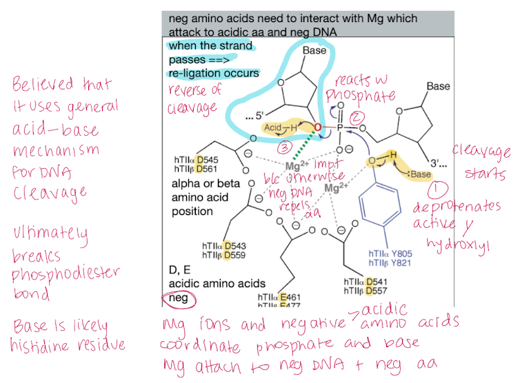 it is believed that an acid-base mechanism is used for DNA cleavage similar to topoisomerase I