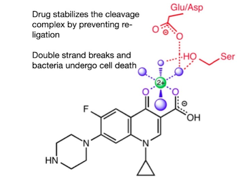 Ciproflaxin is an antibiotic used to treat bacterial infections by interrupting DNA replication and by inhibiting topoisomerase II in prokaryotes