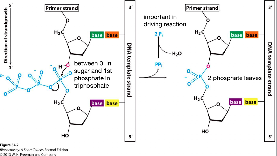 This releases Pyrophosphate (PPi) which seperates into 2 Pi and H20. This drives the reaction where the base is added to the growing strand and 2 phosphates (from the tri chain) leave