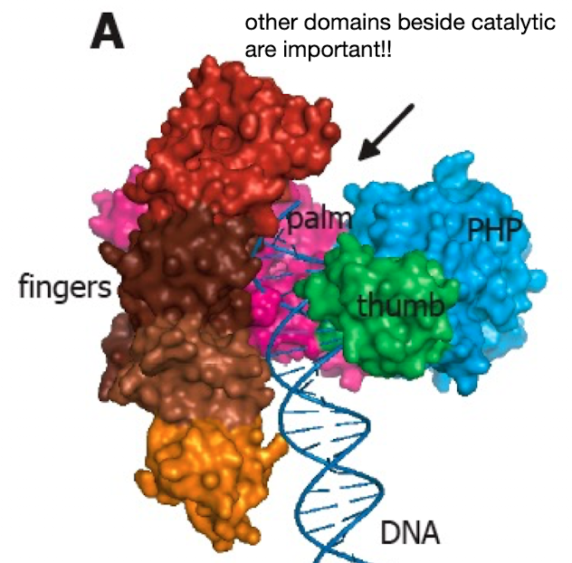 important for catalysis and has several residues within the fingers that bind to incoming dNTPs