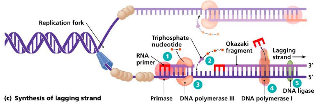 Initiation (DNA helicase, topoisomerase, SSBPs, DNA primase)