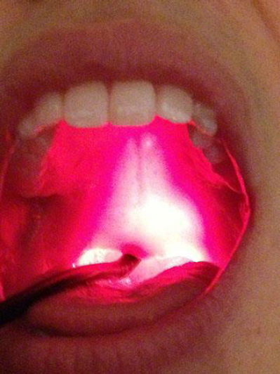 The photograph demonstrates through transillumination an absent normal levator muscle sling found in an occult submucous cleft palate. Velopharyngeal insufficiency (VPI) after tonsillectomy is a rare but known complication but can occur as frequently as 1:3000 to 1:10,000 tonsillectomies. Most of these complications occur in patients with either an occult or overt submucous cleft palate. With this anatomic variant, the principle of repair is either to restore normal anatomy with a two-flap palatoplasty or to pair the levator muscles into a functional sling. Techniques to lengthen the palate, such as a Furlow repair, help to obturate the nasal escape and also to improve VPI speech. As such, 8 weeks after VPI onset, the speech pathologist will have difficulty correcting the anatomic deficiency of lacking levator sling. The tensor tenopexy stabilizes the tendon of the tensor tympany to the hamulus during cleft palate repair, and stents open the eustachian tube but will not improve VPI speech.