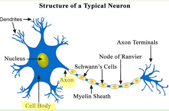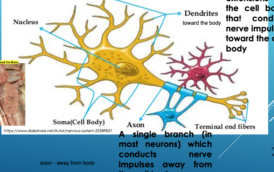 image: know cell body is where the nucleus is and tail is the axon and cell body; for right image, know what motor (from CNS to outwards) and sensory neuron (to CNS) looks like