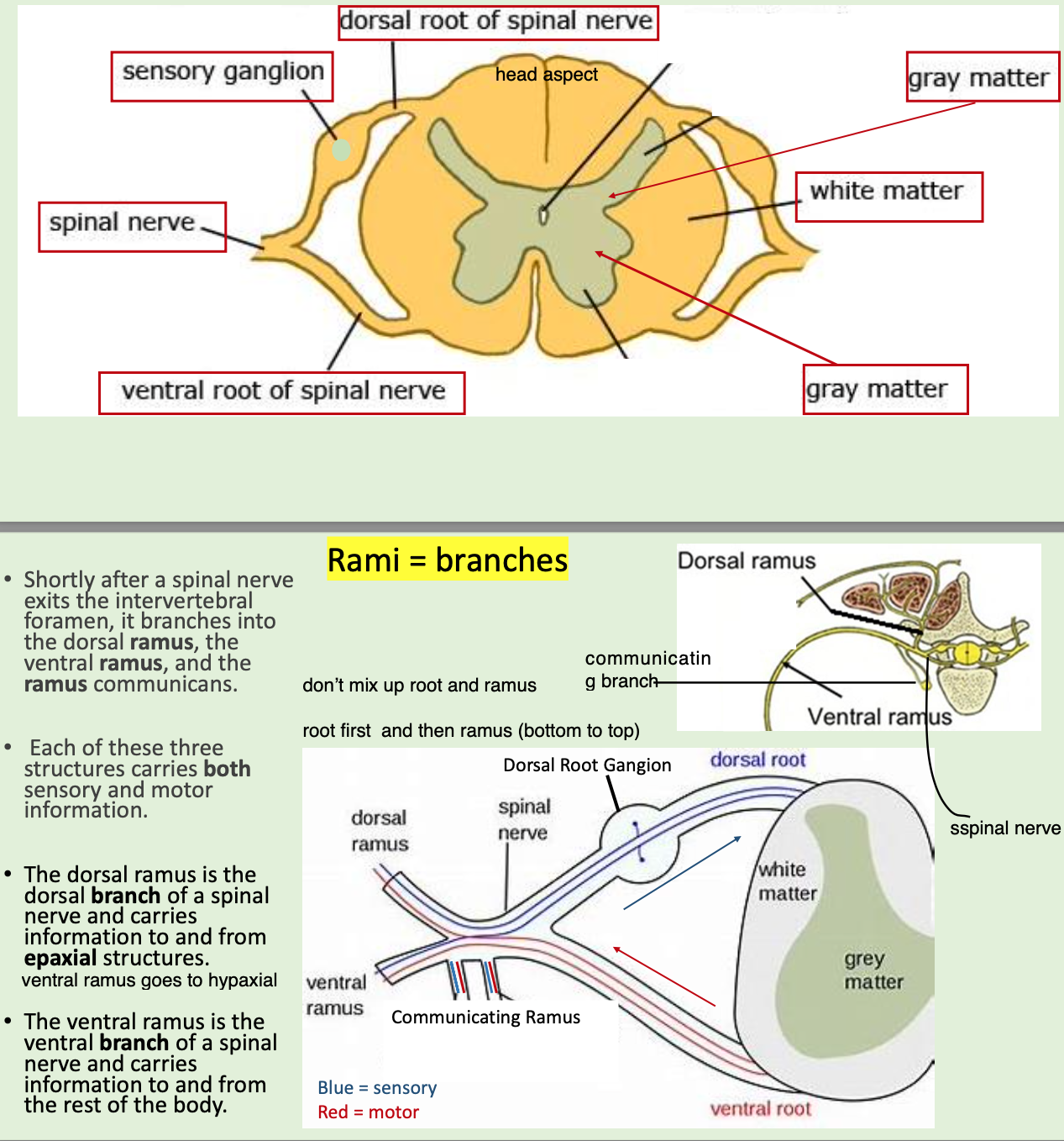 * Shortly after a spinal nerve exits the intervertebral foramen, it branches into the dorsal ramus, the ventral ramus, and the ramus communicans (see where this is present in bottom pic).