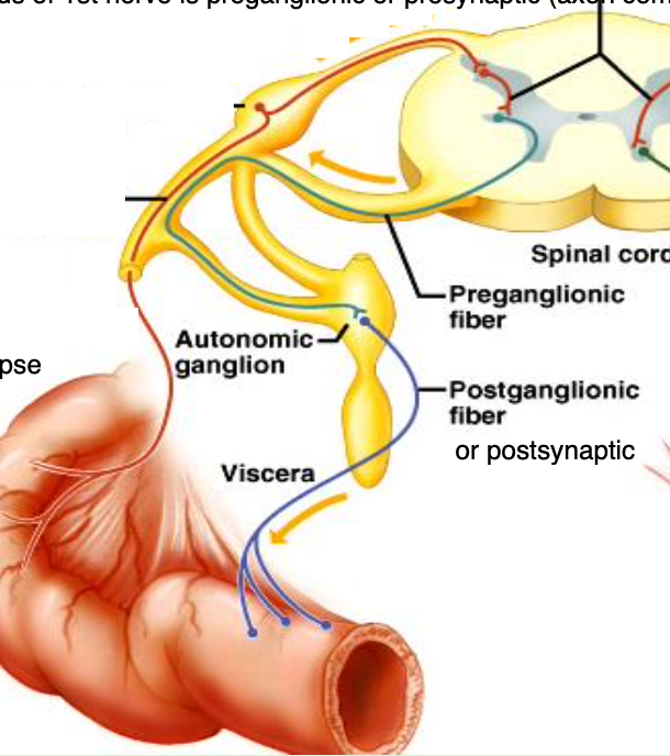* Axon exits the CNS; synapses onto a second autonomic neuron in a ganglion