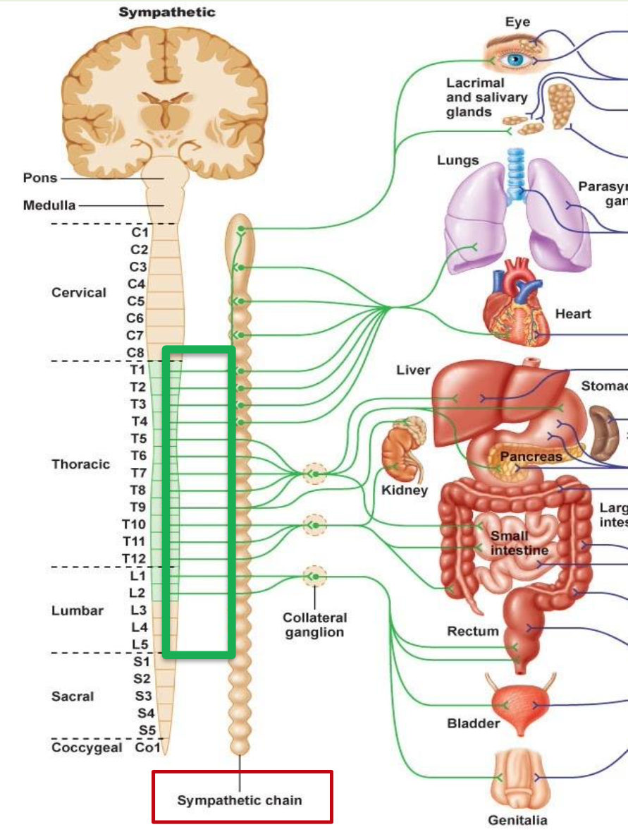 sympathetic goes through the communicative branch where each cell body is for preganglionic and postganglion and where the ganglion is (where passing of baton happens)