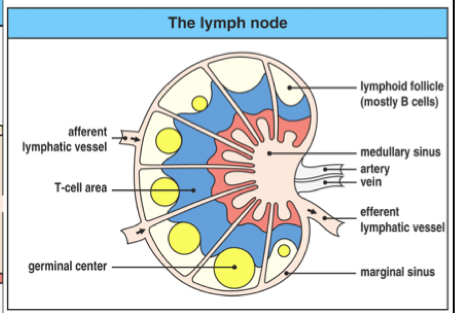Describe the basic structure of a lymph node, with reference to the T cell area and B cell area