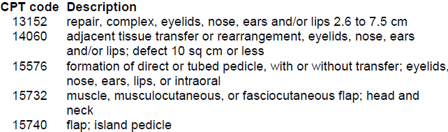 Complex repairs do not involve the formation of a pedicled flap and do not create a donor site, although they do include undermining. Adjacent tissue transfer involves movement of tissue directly adjacent to the flap, such as in rotation flaps or transposition flaps. Adjacent tissue transfers are usually not staged procedures, while distant flaps (15570-15650) are often staged. The nasolabial flap is not a muscle, myocutaneous or fasciocutaneous flap. Examples of flaps included in the 15732 code include temporalis muscle flaps, temporoparietal fascia flaps, and sternocleidomastoid muscle flaps. Island pedicle flaps are cutaneous flaps transposed into a nearby but not immediately adjacent defect, with a pedicle that incorporates an anatomically named axial vessel, and are transferred through a tunnel underneath the skin and sutured into the recipient site defect. While some nasolabial flap reconstructions are performed as island pedicle flaps, this one was not. The pedicle was left intact and division was planned at a later stage. Note that codes for excision of the basal cell cancer cannot be used in conjunction with adjacent tissue transfer (14XXX) or complex repair (131XX) series of codes.