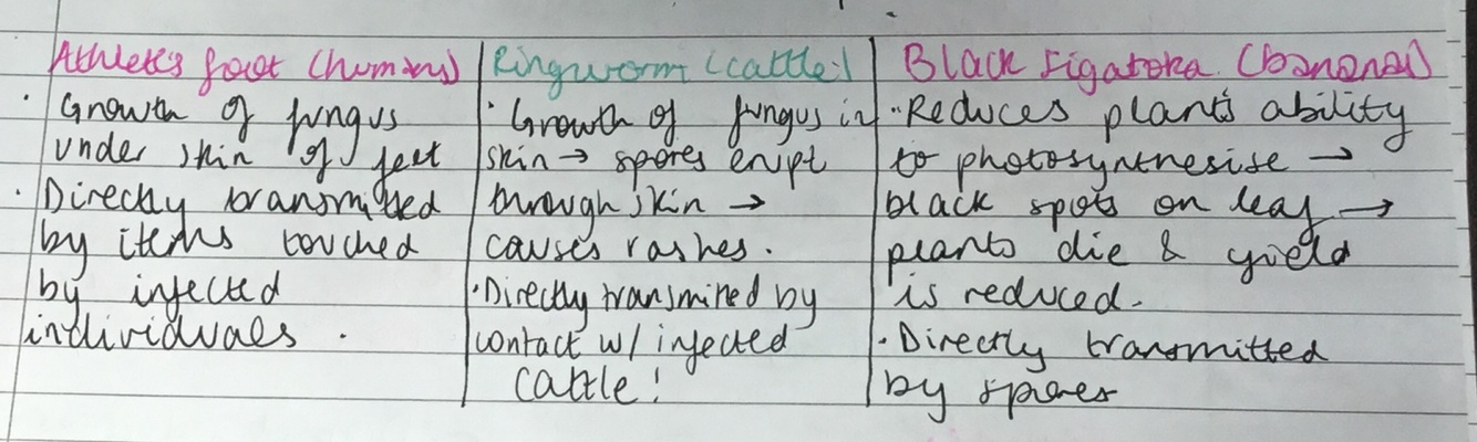 Fungi = hyphae from mycelium spread throughout host skin / vascular tissue -> release spores