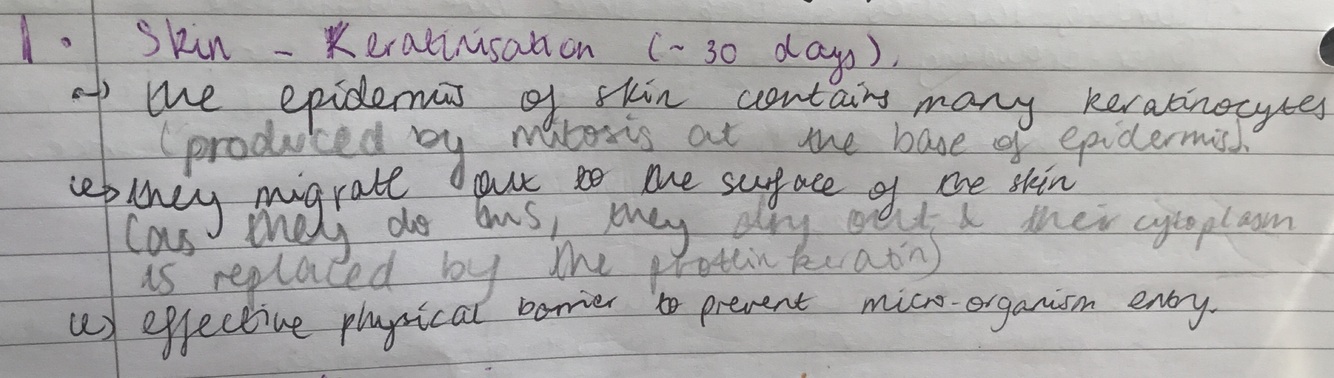 What are the steps of skin keratinisation (~30 days)