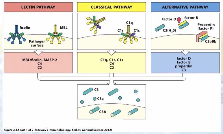 *As três vias de ativação do complemento convergem para a formação de uma mesma estrutura (fragmento protéico) chamado de C3b.