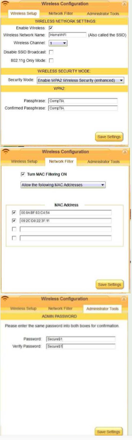 Finally, Laura wants to ensure that only her laptop and Smartphone can connect to the network. Laptop: IP Address 192.168.1.100 Hardware Address: 00:0A:BF:03:C4:54 Smartphone: IP Address 192.168.1.101 Hardware Address: 09:2C:D0:22:3F:11