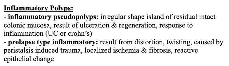 Types: inflammatory, hamartomatous, sessile, adenomatous (neoplastic), etc.