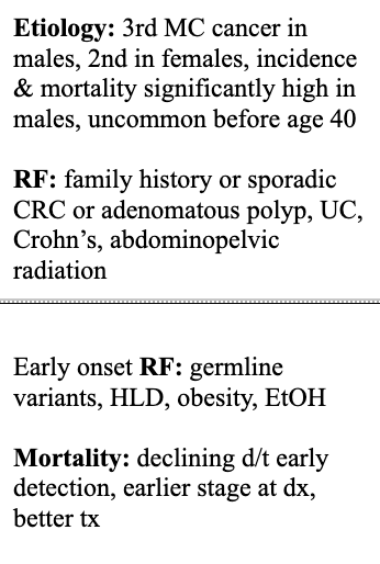 Describe etiology & RF of colorectal cancer