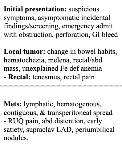 Describe the presentation of initial, localized, and metastasized CRC