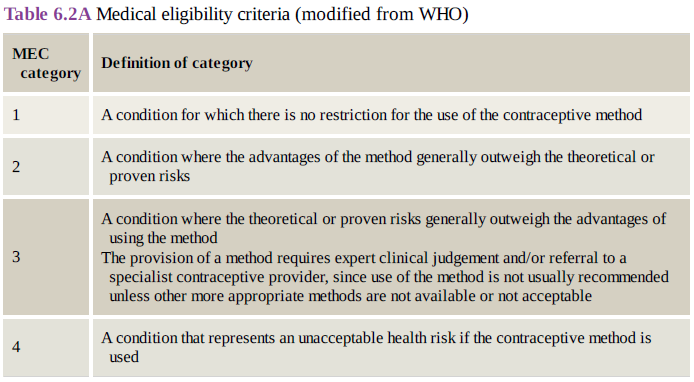 Medical eligibility criteria (MEC) - categories 1-4, where 1 is no restriction on use while 4 represents an unacceptable health risk