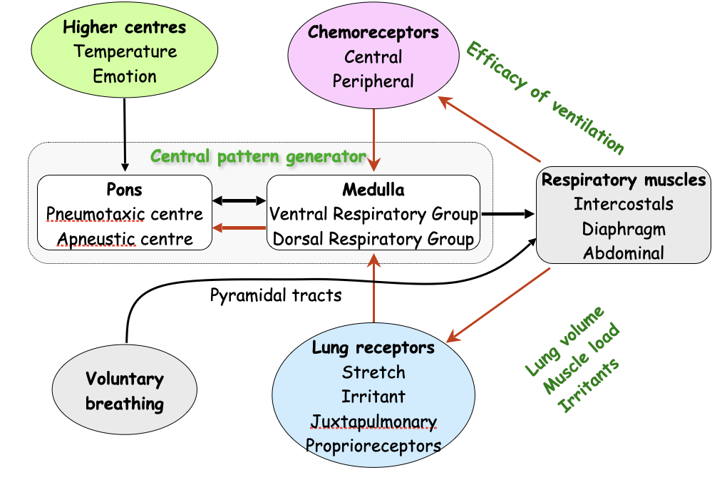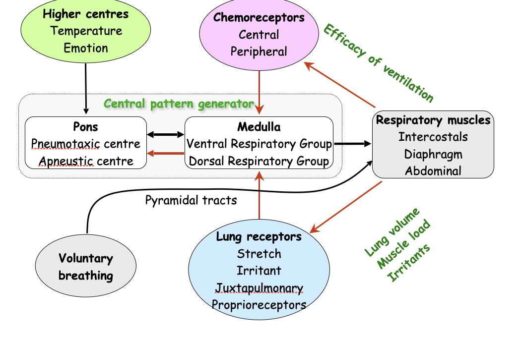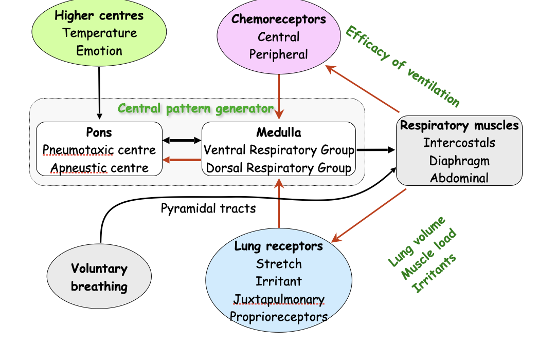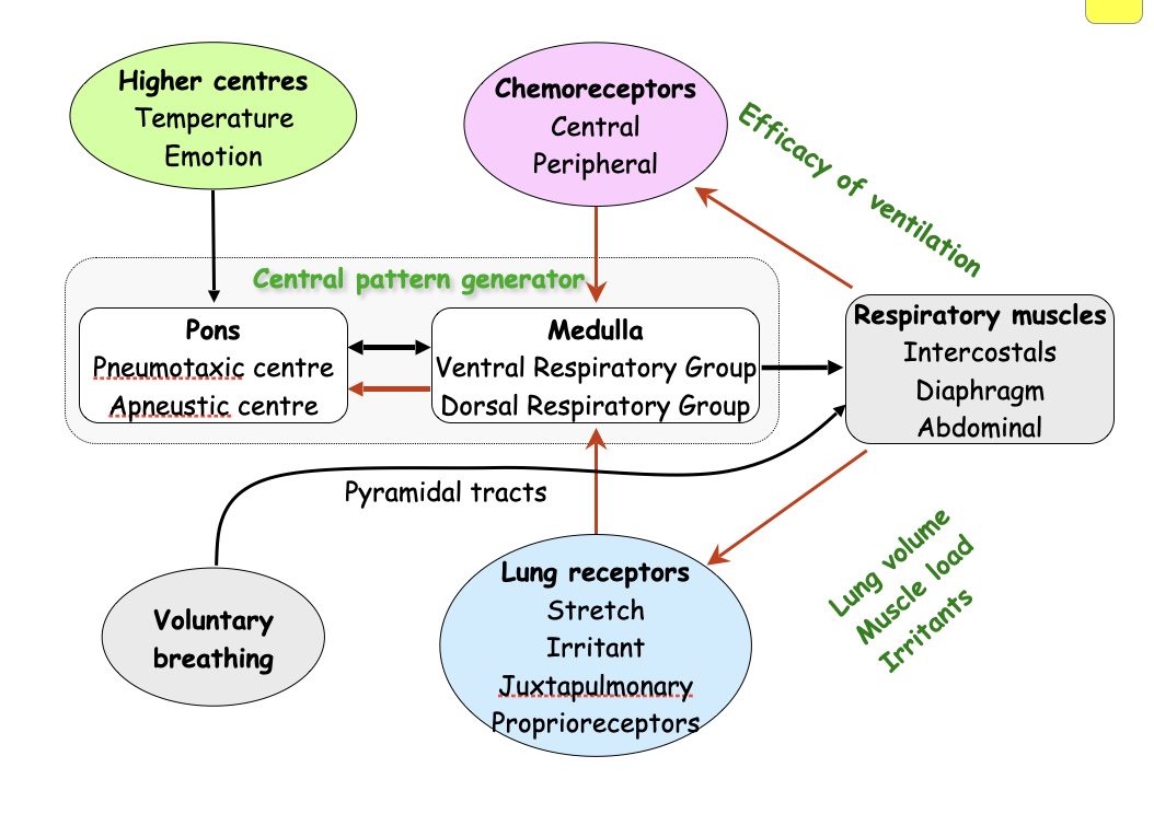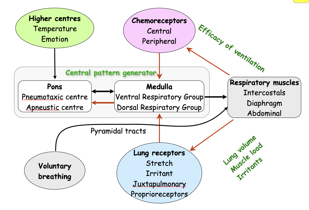 Higher centers include temperature and emotion, which influence breathing patterns.