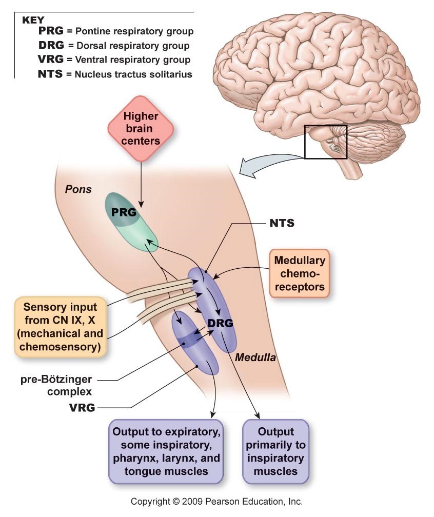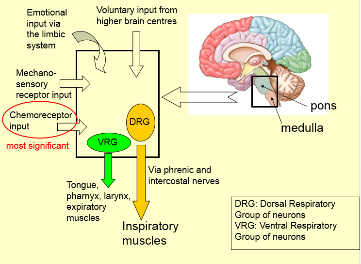 Set an automatic rhythm of breathing through co-ordinating the firing of smooth and repetative bursts of action potentials in dorsal respiratory groups (DRG) which travel to inspiratory muscles