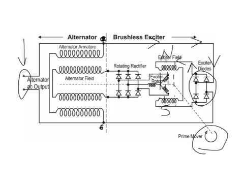 Describe the operation of an Alternator with brushless excitation and AVR