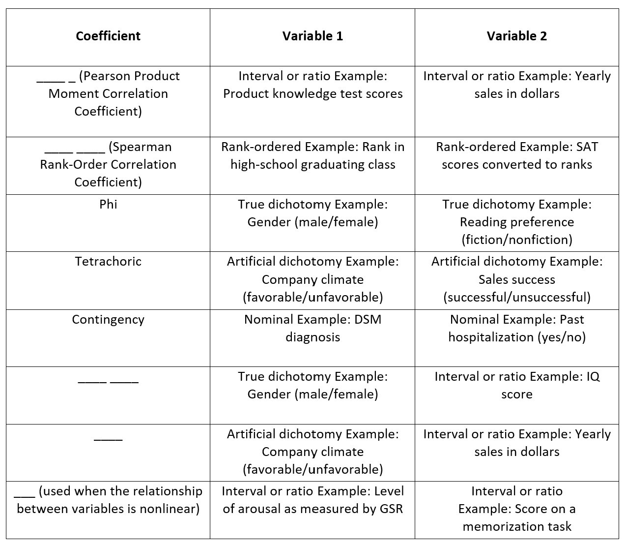 Pearson r; Spearman rho; Point Biserial; Biserial; Eta
