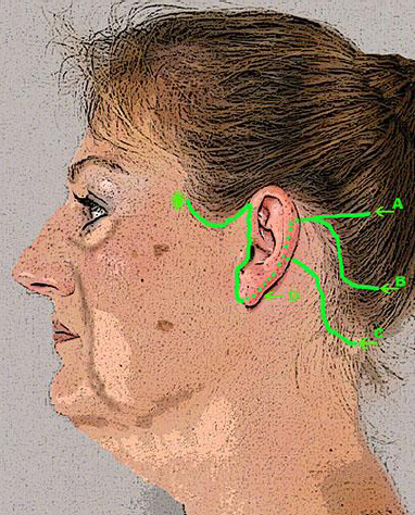 A 65-year-old woman comes to the office for consultation regarding rhytidectomy. On physical examination, skin pinch demonstrates greater than 2 inches of excess neck skin on each side of the face. In the illustration shown, all incisions (A to D) begin at the pre-hairline of the temporal area, extend to the tragal edge, and then go around the ear lobule to the posterior auricular sulcus. Which of the following incision paths is most appropriate to correct the patient’s neck deformity?