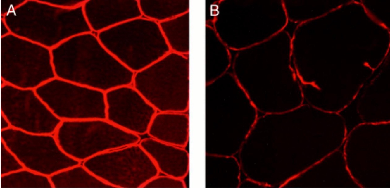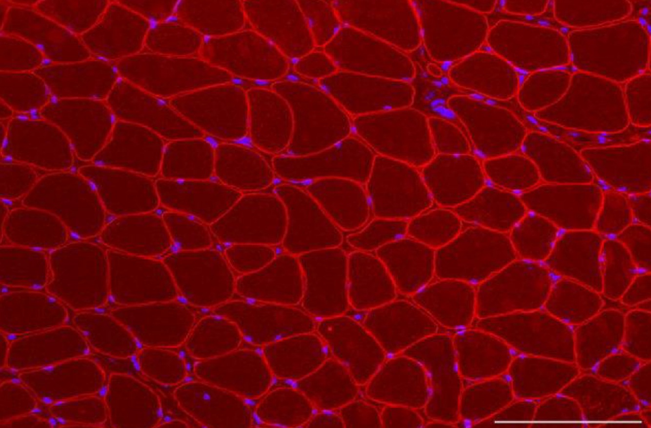 Détection de dystrophine pour mesurer la surface de section transversale musculaire. Marquage IHC (rouge) qui délimite les sarcolemmes and DAPI (bleu) qui permettent de visualiser les noyaux. Scale bar 100m