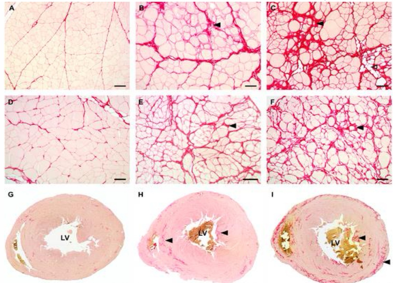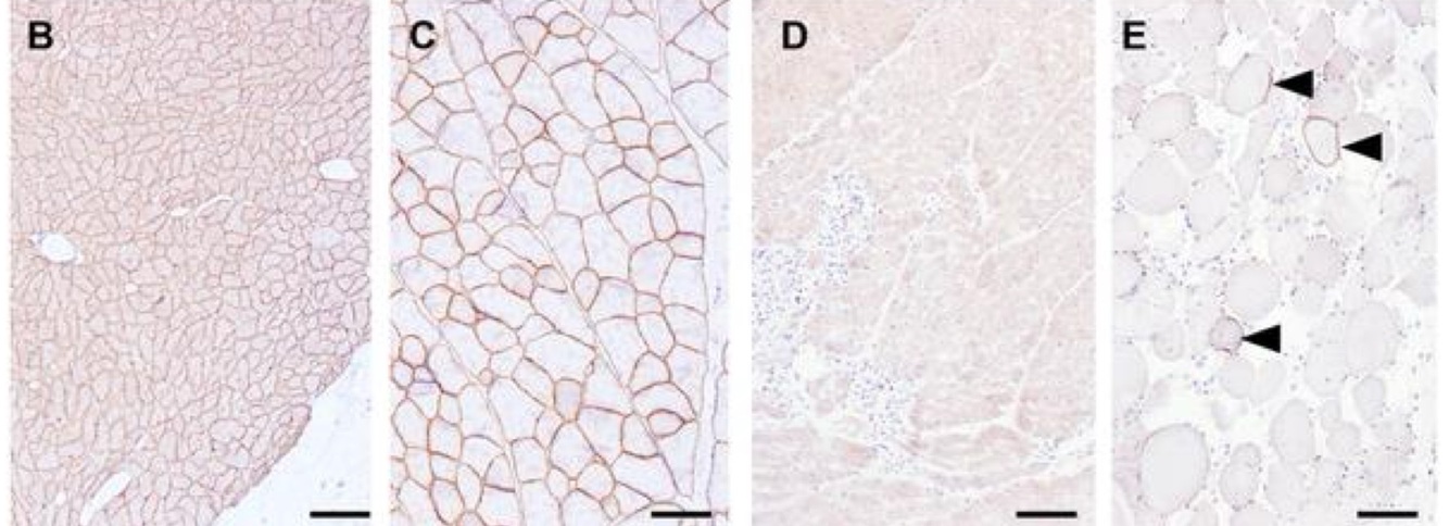 Pas de gêne qui code pour la dystrophine ont été détecté dans les muscles cardiaques et squelettiques des rats Dmdmdx (D, E) = tissu mal organisé