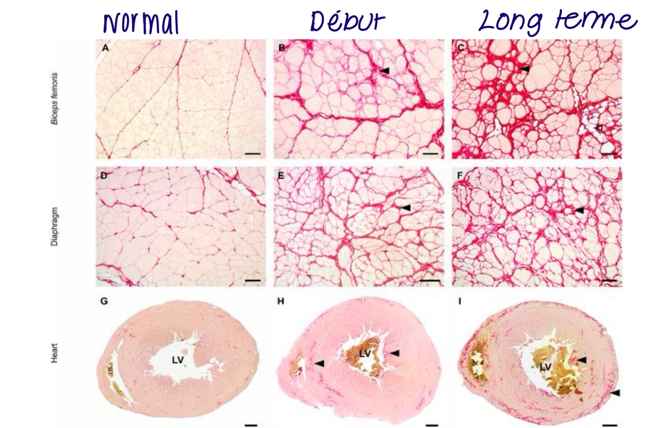 Après quelques années, il y a présence de tissus fibreux/graisseux au travers les fibres musculaires