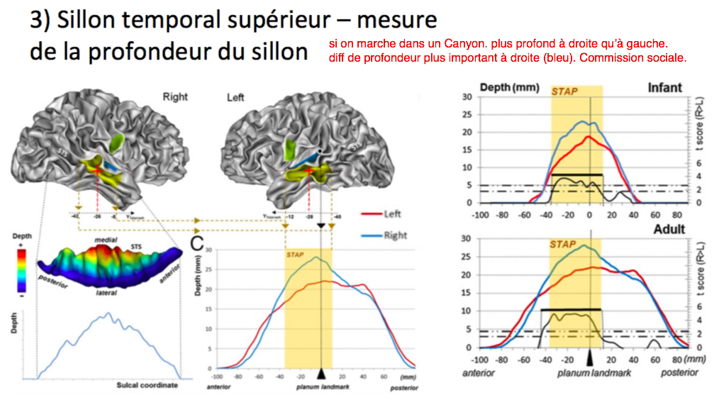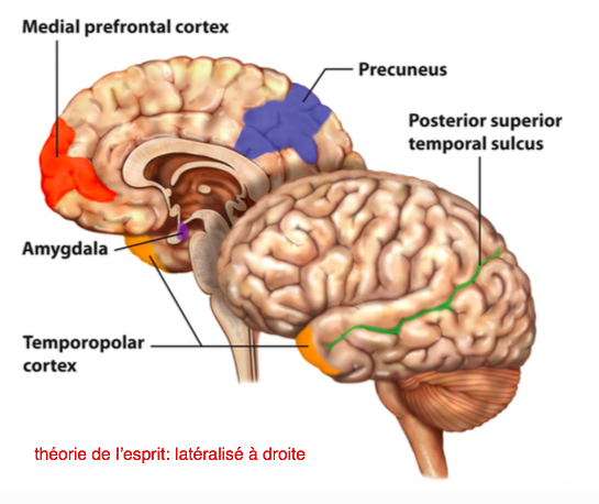 Ø Région importante pour la cognition sociale plus étendue à droite