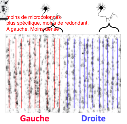 Pattern de connectvité des dendrites et distribution de l’input différents entre gauche et droite: donne potentiellement un traitement de l’information moins redondant et plus spécifique à gauche.