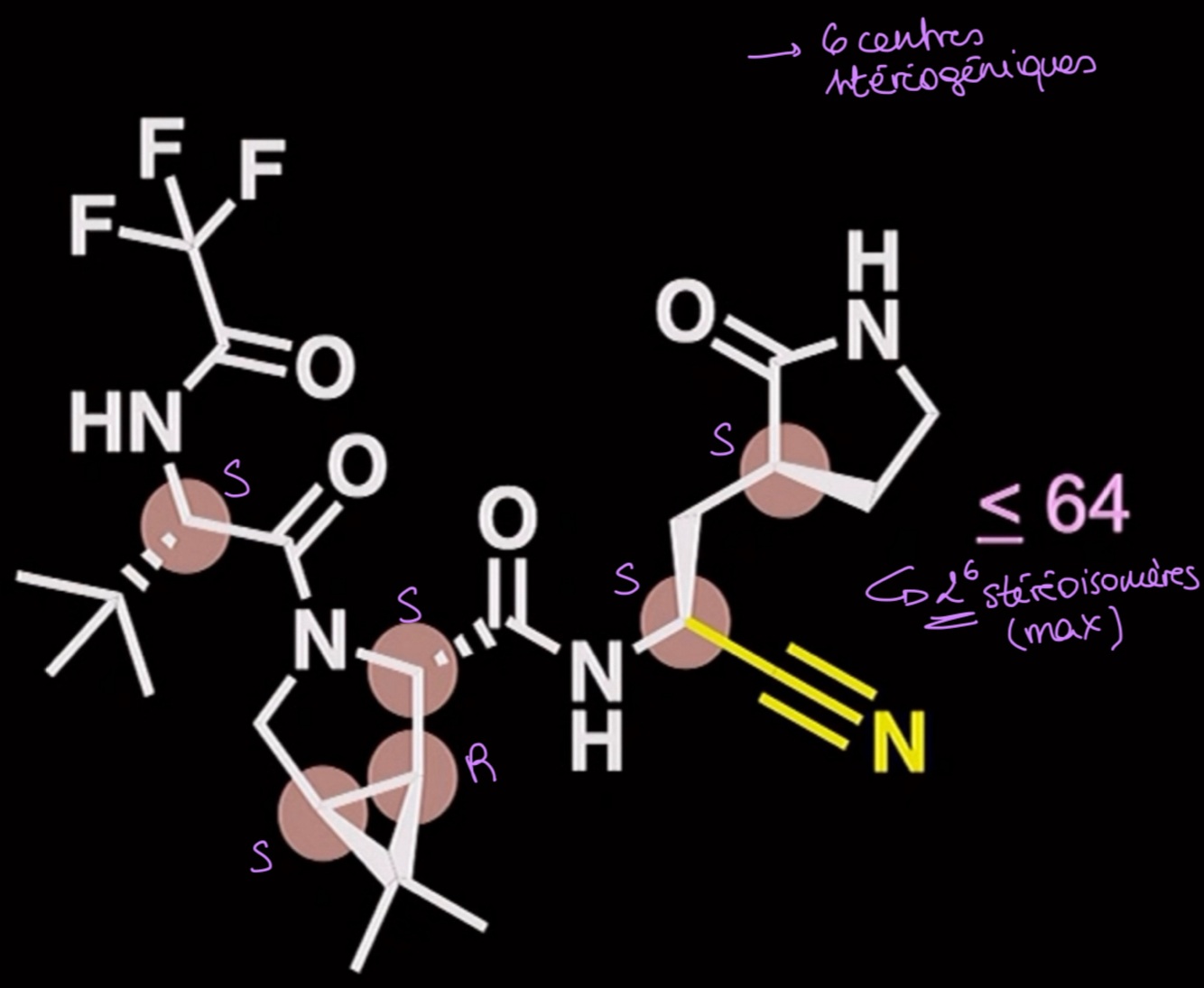 Donner le nb de centres stéréogéniques, de stéréoisomères max et les conformation R et S qu’on peut voir sur le Paxlovid