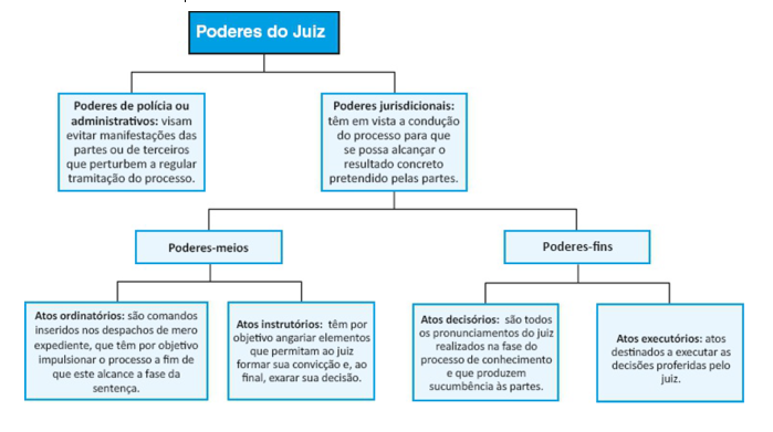 Os poderes-fins do magistrado podem se dividir em: atos ordinatórios (são os despachos de mero expediente) e atos instrutórios (são aqueles praticados com a finalidade de reunir elementos de convicção capazes de permitir ao juiz a aplicação adequada do direito material).