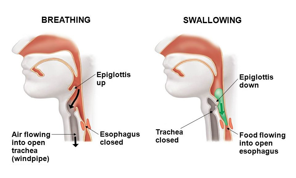 During swallowing, epiglottis flattens and moves posteriorly to close off the larynx to prevent aspiration of food