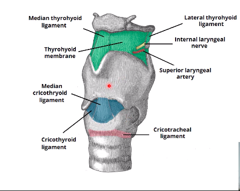 Internal laryngeal nerve and superior laryngeal artery come through this ligament/membrane