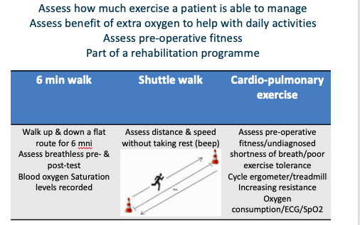 Assess pre-operative fitness/fitness state/extent of breathlessness/benefit of oxygen therapy