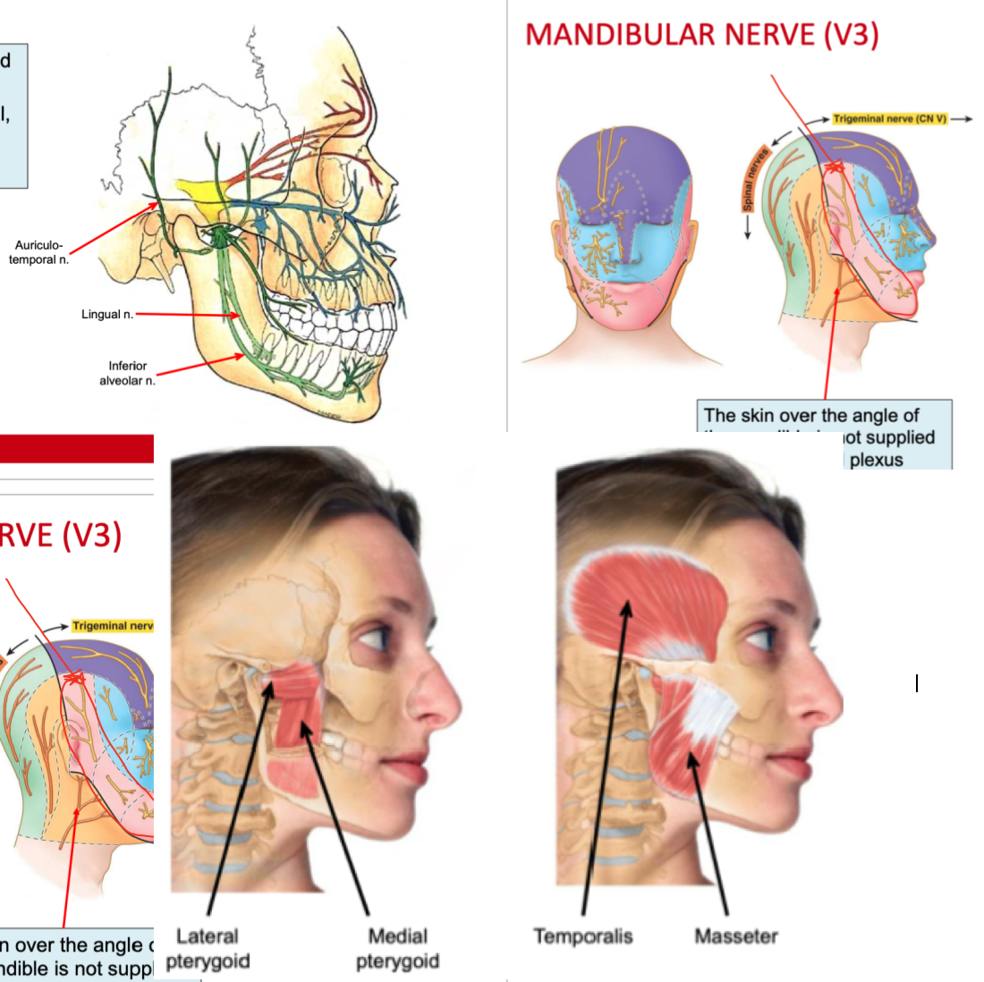 - Muscles of Mastication: lateral, Pterygoid, Medial Pterygoid, Masseter and Temporalis