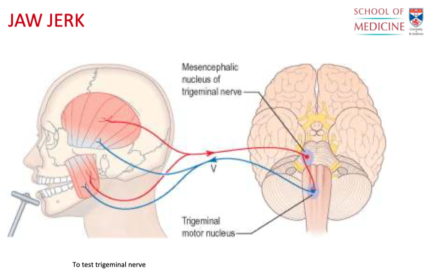 A tendon hammer is tapped on crevice above chin to test trigeminal nerve