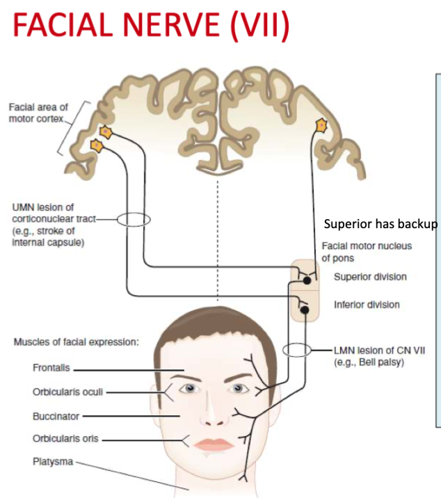 Motor nucleus has a superior and inferior divisions which innervate upper and lower facial muscle respectively