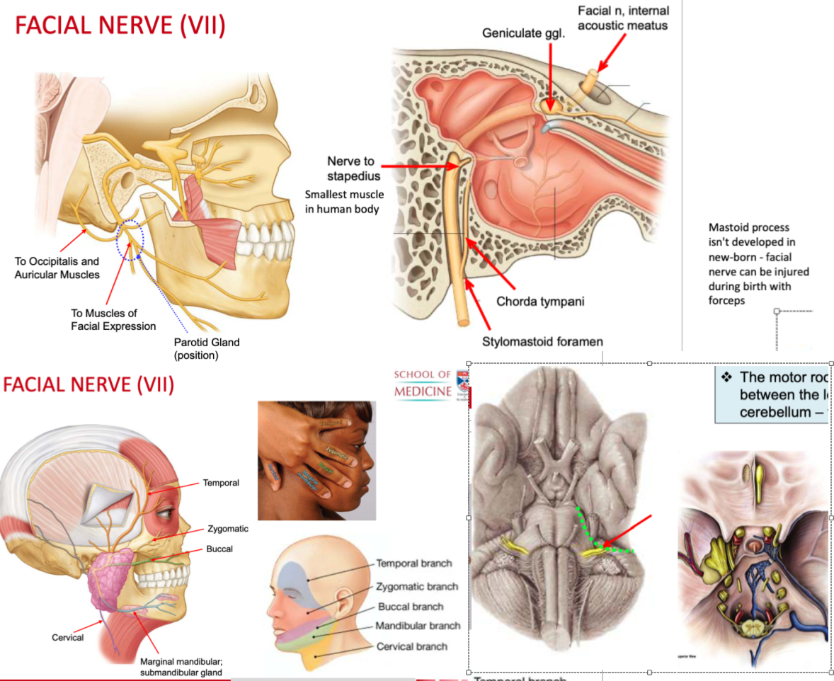 5 nerves branch off and supply the muscles of facial expression, posterior belly of digastric and stylohyoid