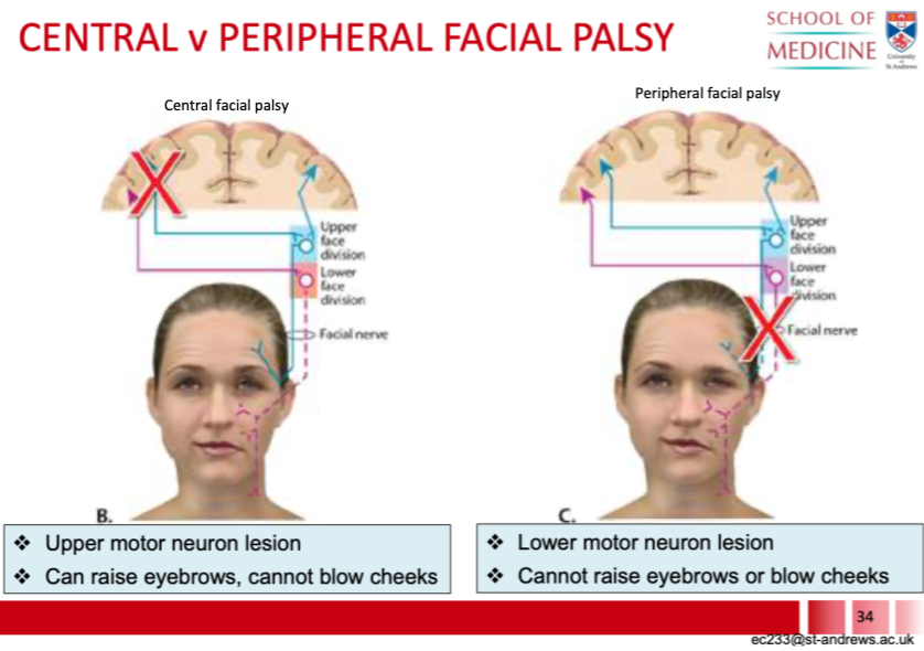 - Cannot raise eyebrows or blow cheeks