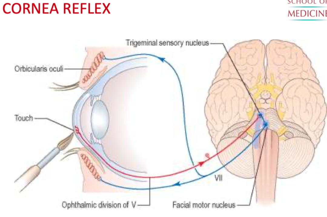 The corneal blink reflex is caused by a loop between the trigeminal sensory nerves (ophthalmic division) to the trigeminal sensory nucleus and they send out motor impulses through the facial motor nucleus which causes obicularis oculi to contract and shut eyelid.